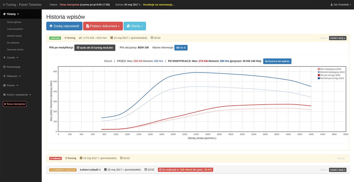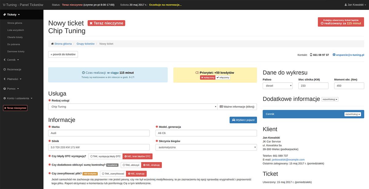 Mit dem Gerät lesen wir die Datei aus dem Motorsteuergerät aus. Die ausgelesene Datei wird online über das Ticketsystem direkt an die Programmierer von V-Tuning gesendet. Unser Panel ist eine fortschrittliche und benutzerfreundliche Plattform, die für jeden geeignet ist. Aus dem Katalog können Sie schnell das Fahrzeug und die Art der Dienstleistung auswählen.