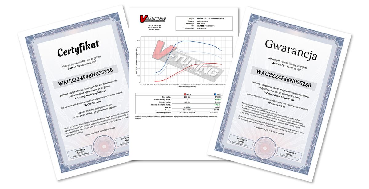 - ein Zertifikat, das die Korrektheit der von V-Tuning ausgeführten Software bestätigt,